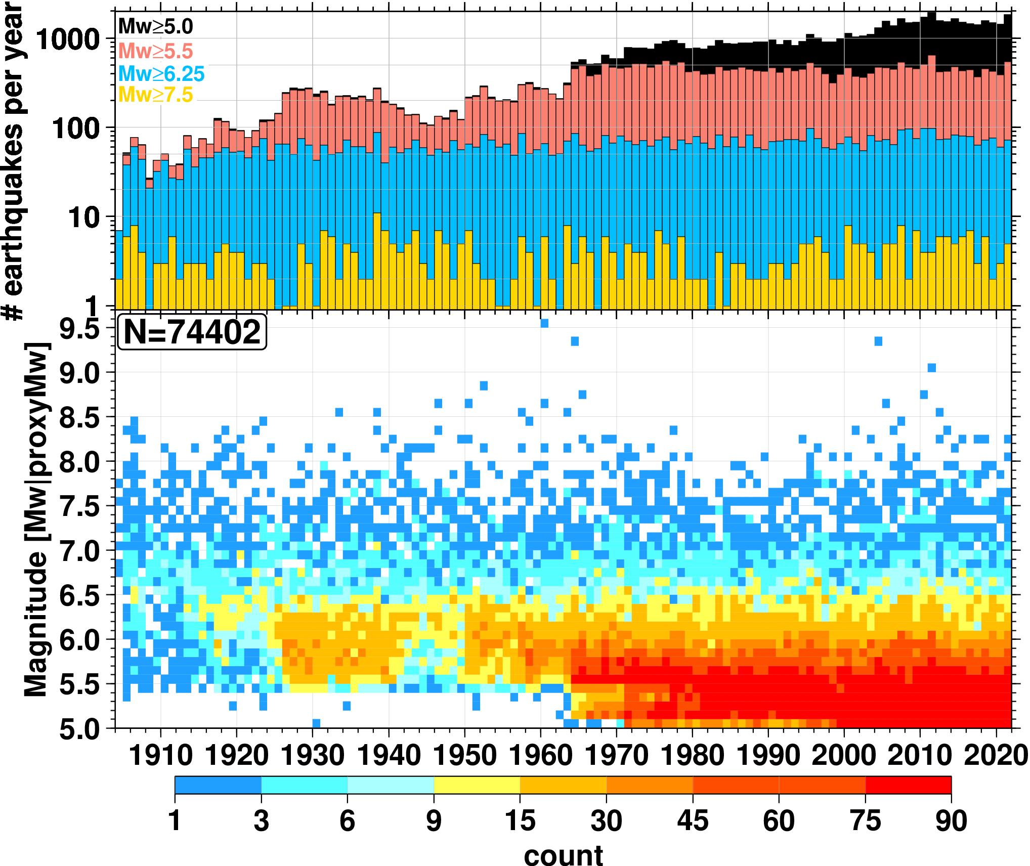 Fig. 2: Top: cumulative annual number of earthquakes with Mw ≥ 5.0 (black), Mw ≥ 5.5 (red), ≥ 6.5 (blue) and ≥ 7.5 (yellow); Bottom: time-magnitude distribution color-coded in cells of 0.1 units of Mw for each year of the ISC-GEM main catalogue. For comparison with the original version see Fig. 20 in Di Giacomo et al. (2015b), or Figure 25 in Di Giacomo et al. (2018) for the comparison with Version 5.0.