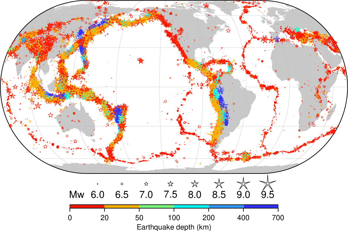 Fig. 1 shows the ISC-GEM locations with symbols according to Agnew (2014) as obtained from the procedure described in Bondár et al. (2015). One feature that makes the ISC-GEM Catalogue a unique product is that the locations are achieved by the same location technique and velocity model (ak135) and comes with uncertainties for each focal parameter.